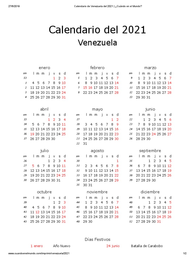 Calendario Año 2021 Venezuela Con Feriados Y Bancarios
